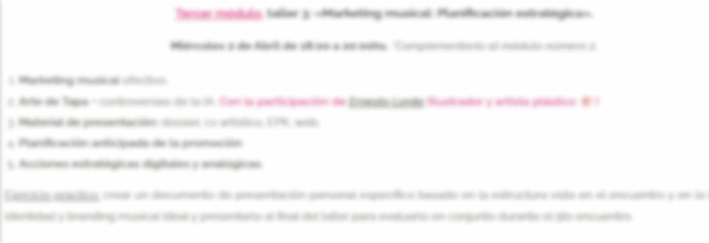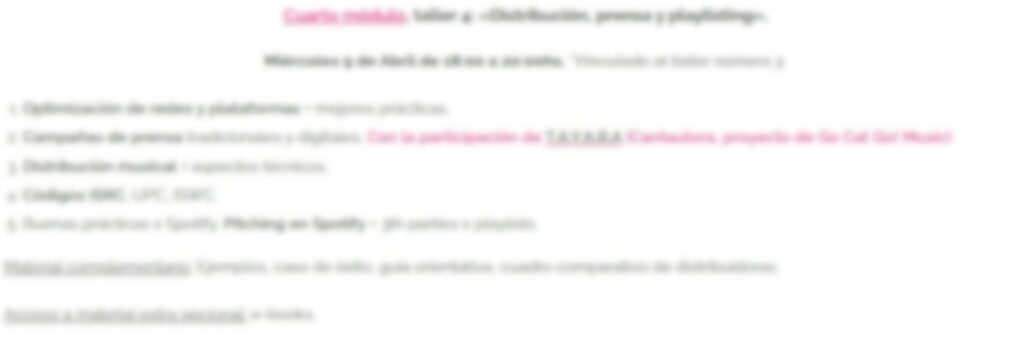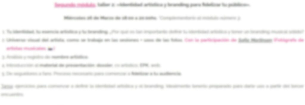 El programa de este taller modular fué pensado para ofrecerte una manera práctica, honesta y completa de ampliar tu conocimiento sobre la Industria Musical, de organizar o reorganizar tu proyecto y de poner en práctica información valiosa, análisis estratégicos, recursos, herramientas y consejos para comenzar a autogestionarte, visibilizarte y promocionarte de manera auténtica, creativa y profesional, para así lograr dar inicio al cumplimiento de tus objetivos y sueños mientras tu música pasa a formar parte de la vida de más y más personas.