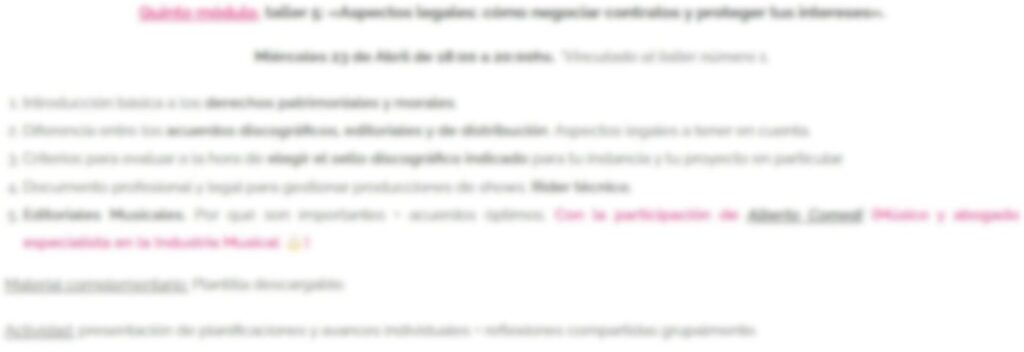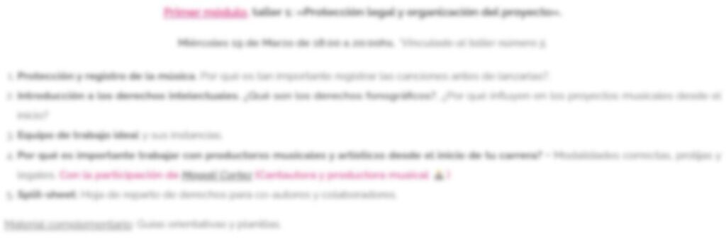 Juntxs, trabajaremos en reorganizar y profesionalizar tu proyecto musical, paso a paso, a medida que avanzamos en el programa. Mi objetivo es que finalices los 5 módulos del taller llevándote una visión clara, orientación y un plan de acción concreto para comenzar a transformar tu proyecto en un negocio escalable y de disfrute.